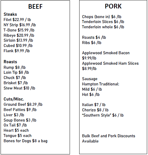 Buy local meat. We partner with several farmers from the local area to source high quality animals. Hampton Meat Company offers whole, 1/2, or 1/4 beef. Reserve your beef today.